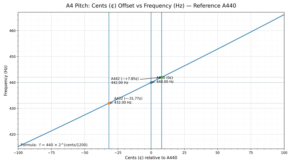 Use this interactive slider to convert cents (¢) to frequency in Hertz (Hz) for A4 (the A above middle C), starting from the standard reference A4 = 440 Hz. A4 = 440 Hz (A440) is the modern concert pitch standard (ISO 16). Slide flat or sharp and watch the frequency update instantly—perfect for unusual tuning requests like A432, and for aligning player-system playback with a tuned acoustic piano.