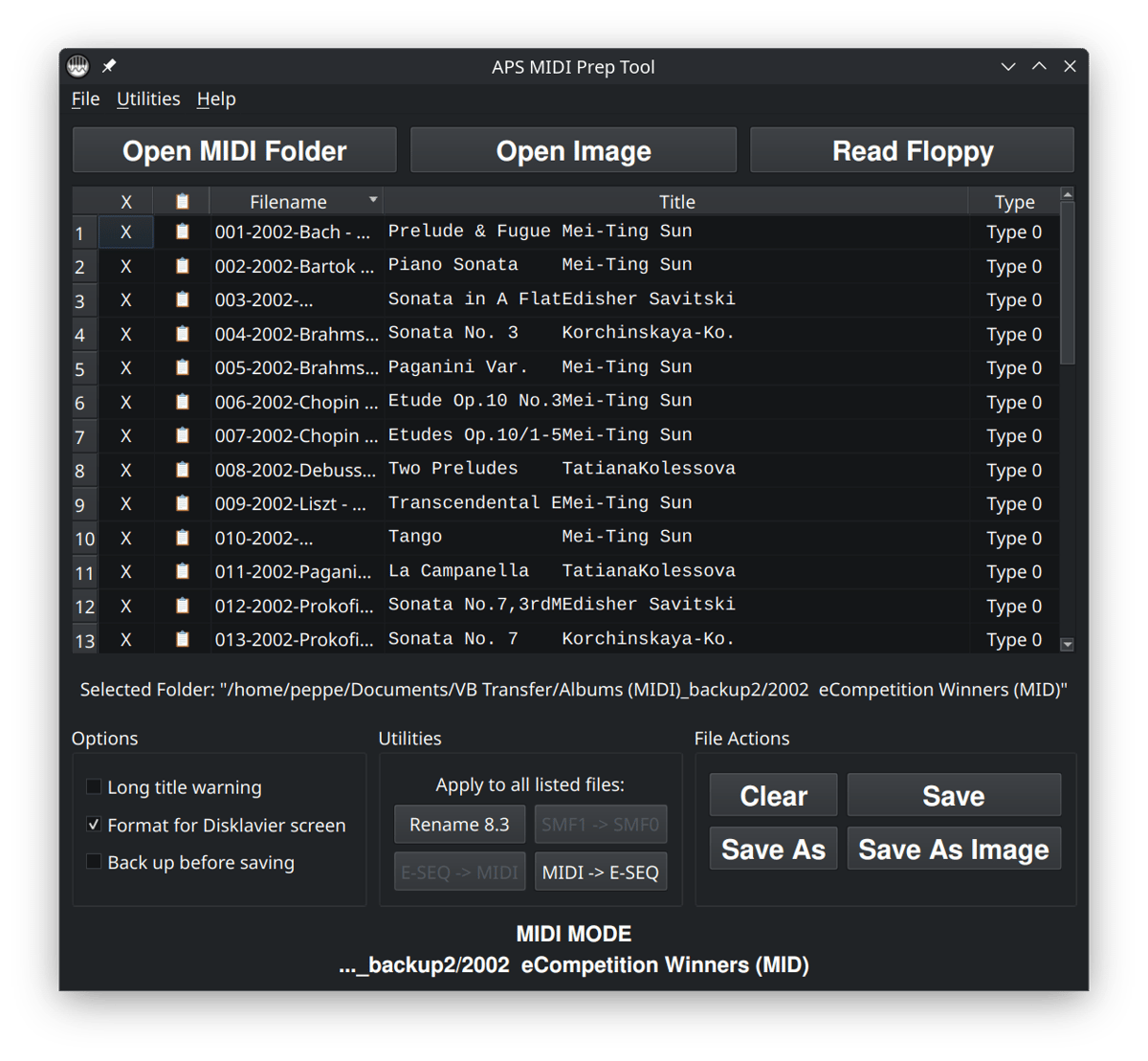 Once the filenames and titles look right, copy the prepared MIDI files to the place you normally use them. That might be a USB stick, a folder used by a floppy emulator, a computer connected to the piano, or another playback system.