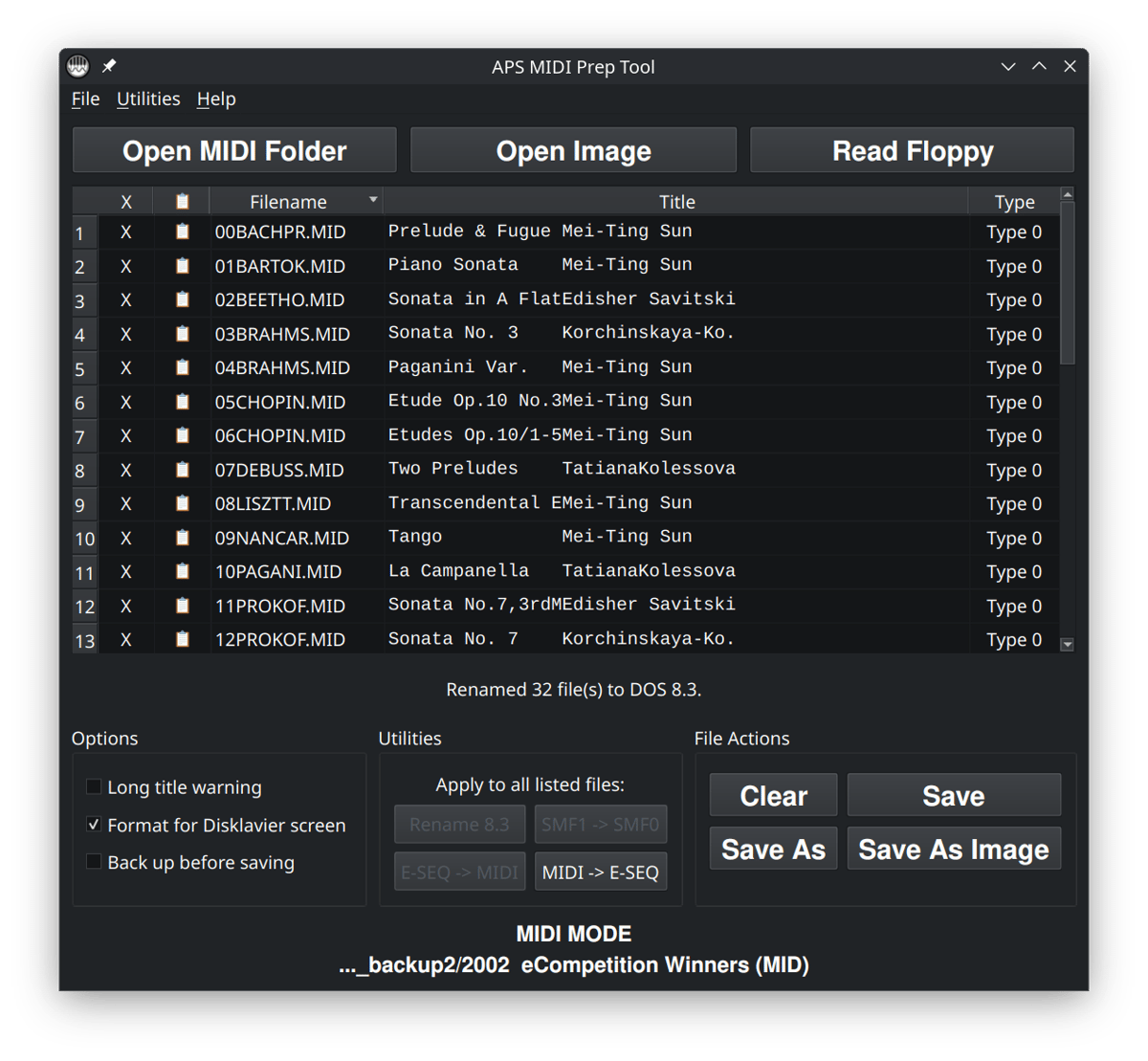 Rename 8.3 and MIDI -> E-SEQ are highlighted. We won’t use these here, but they’re available because APS MIDI Prep Tool is in MIDI MODE.Step 3: Edit the MIDI titles