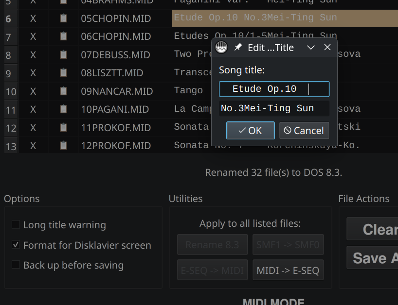 If you are preparing files for a legacy player system, floppy emulator, or older Disklavier workflow, click Rename 8.3. This renames the listed files using short DOS-style filenames.