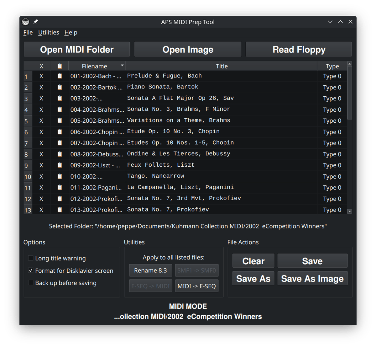 APS MIDI Prep Tool can do several more advanced jobs, including working with floppy images, E-SEQ files, and PIANODIR.FIL. This page is intentionally narrower than that. We are not starting from a floppy disk here. We are starting with .mid or .midi files that are already on your computer.
