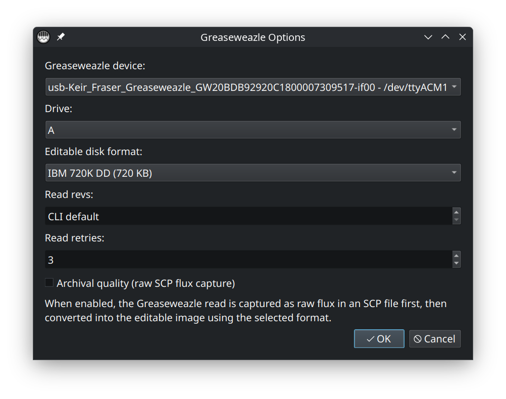 If you check Archival quality, you’ll be given the opportunity to save a raw SCP image of the disk. This is a high-detail copy of the disk’s magnetic flux. I use this whenever a disk is irreplaceable so that I can maintain a long-term, safe copy.