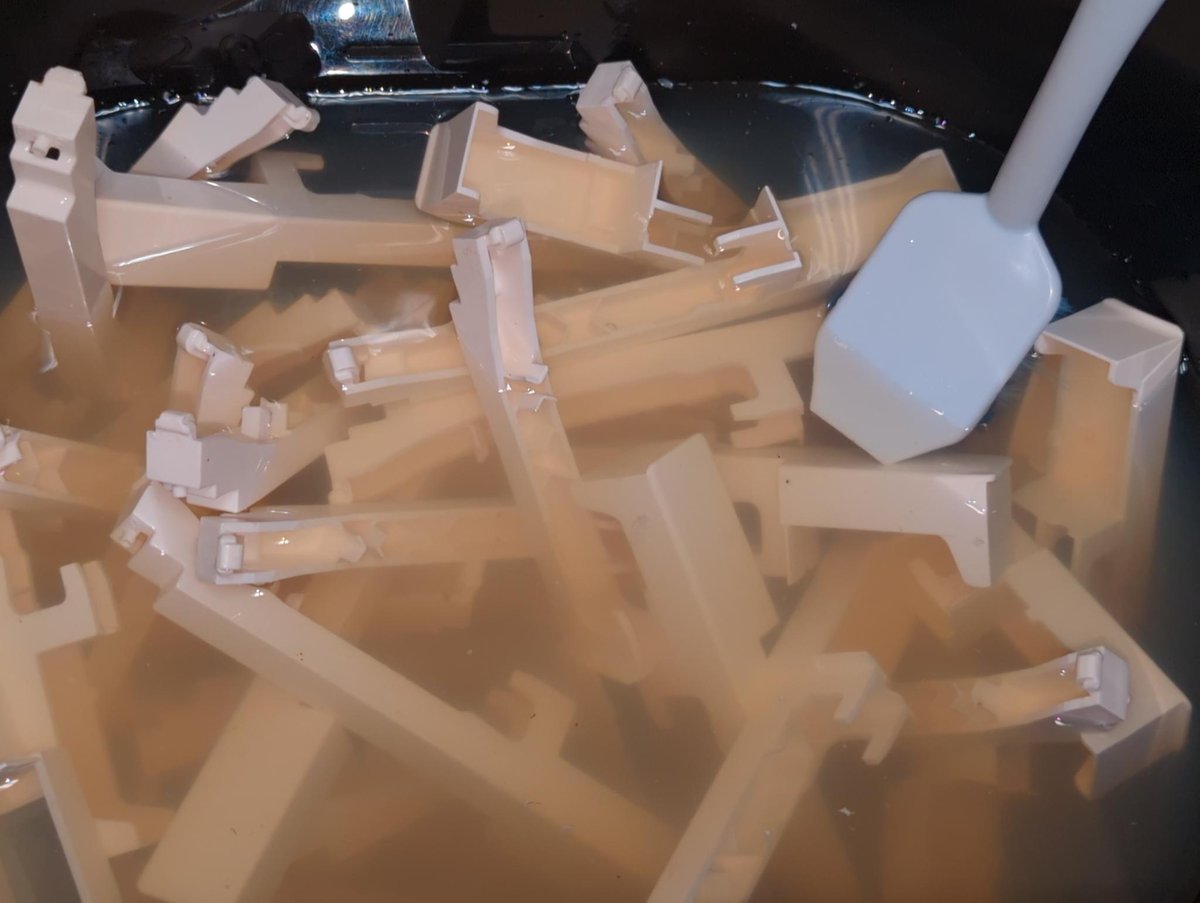 There are several reputable technicians who recommend using diluted lye to remove the red goo. Mix a lye bath in a plastic container—do not use metal containers. Community recipes vary; for example, a common formula is about 1 molar (≈80 g NaOH in 2 L water). Always add lye to water, not the other way around, and expect heat.