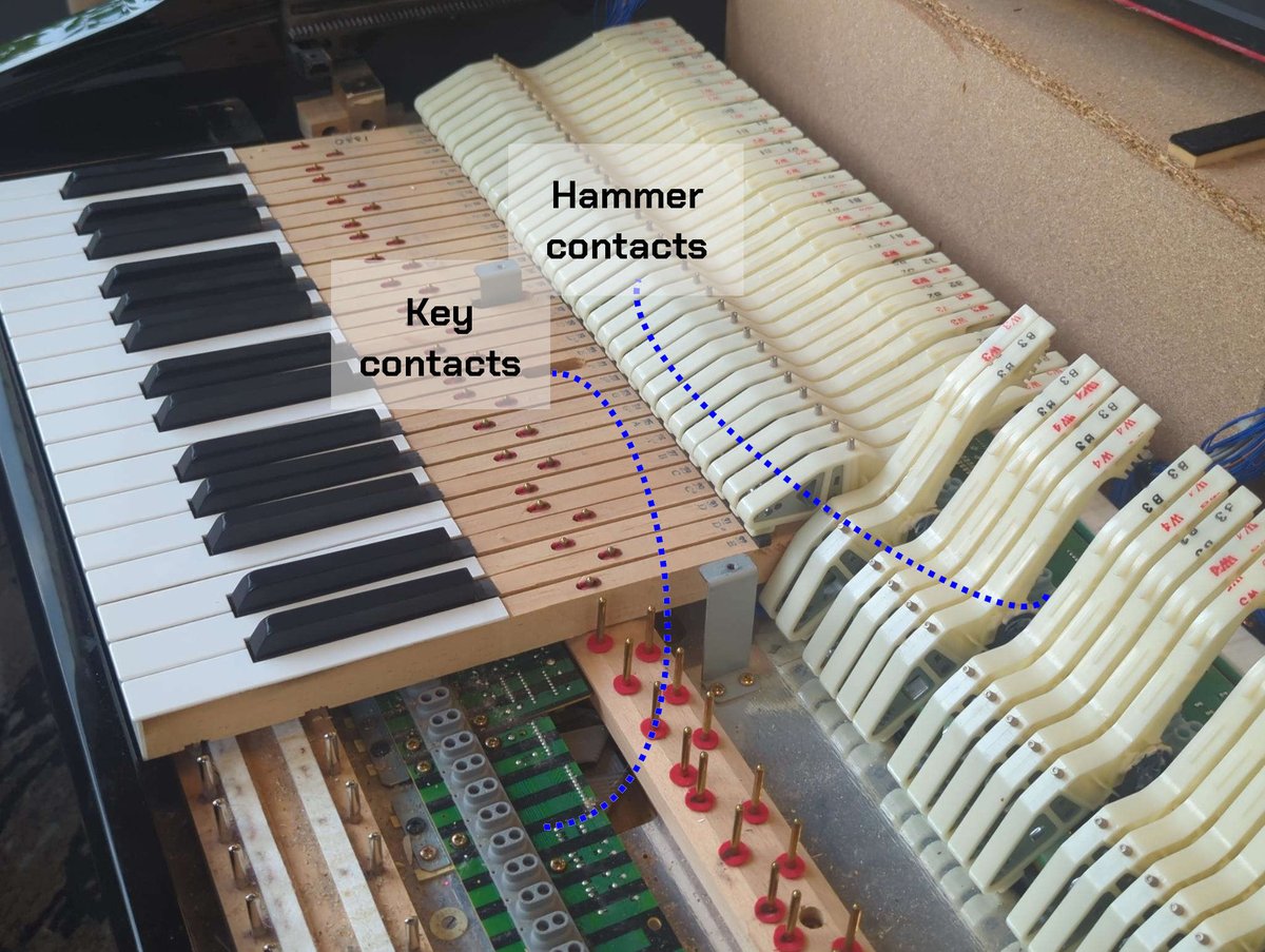 The hammer contacts determine the velocity, and the key contacts determine whether the key is pressed. If you have a key that’s sounding much too loudly, this is because of a hammer contact. If a key isn’t sounding at all, this is likely because of a key contact.